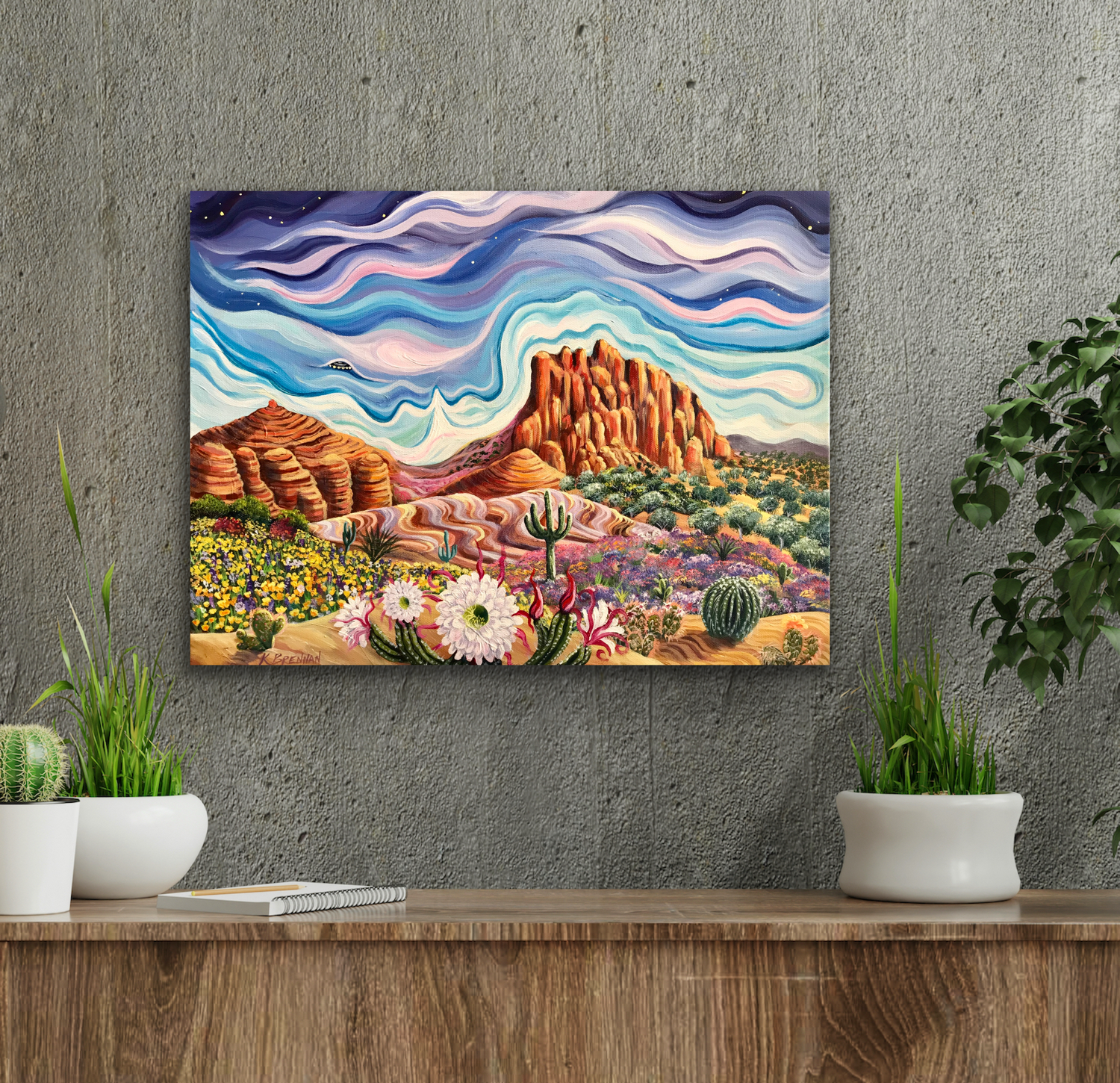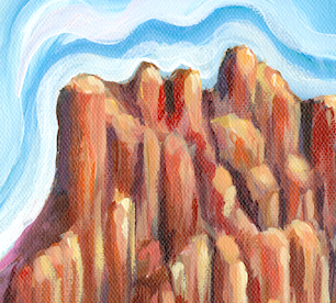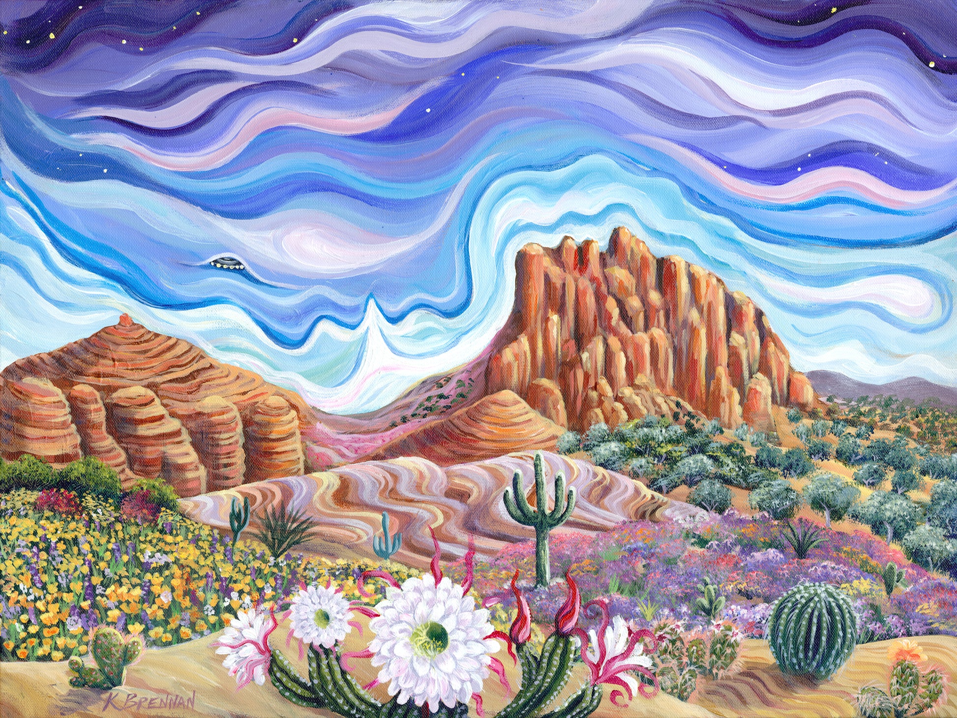 Sky's Fertile Breath was originally inspired by my hiking adventures in the deserts of Arizona and Nevada. Many times while my husband and I were hiking, we felt a wonderful and earthy presence there. By the way, can you find the two faces in the image? Hint: Think Earth and Sky.