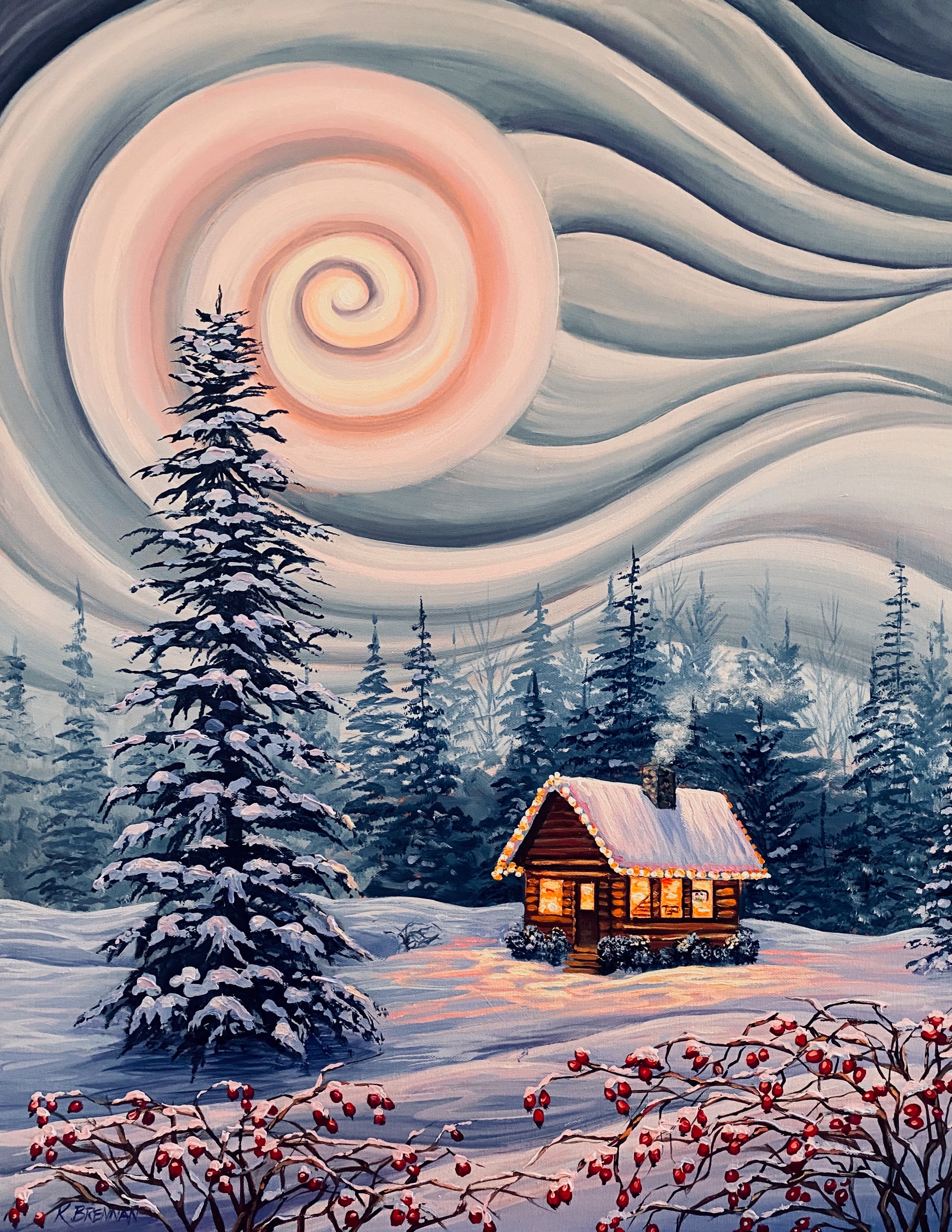"A Frozen Oasis”, an oil and acrylic painting by K. Brennan depicts a snowy, glowing mountain cabin nestled in the forest with the swirling sky inspired by Van Gogh. Blue, gray and rose colored hues color the landscape and warm golden tones shine from within the log home.