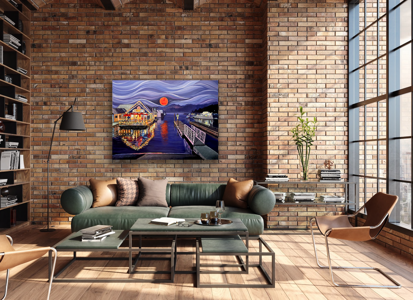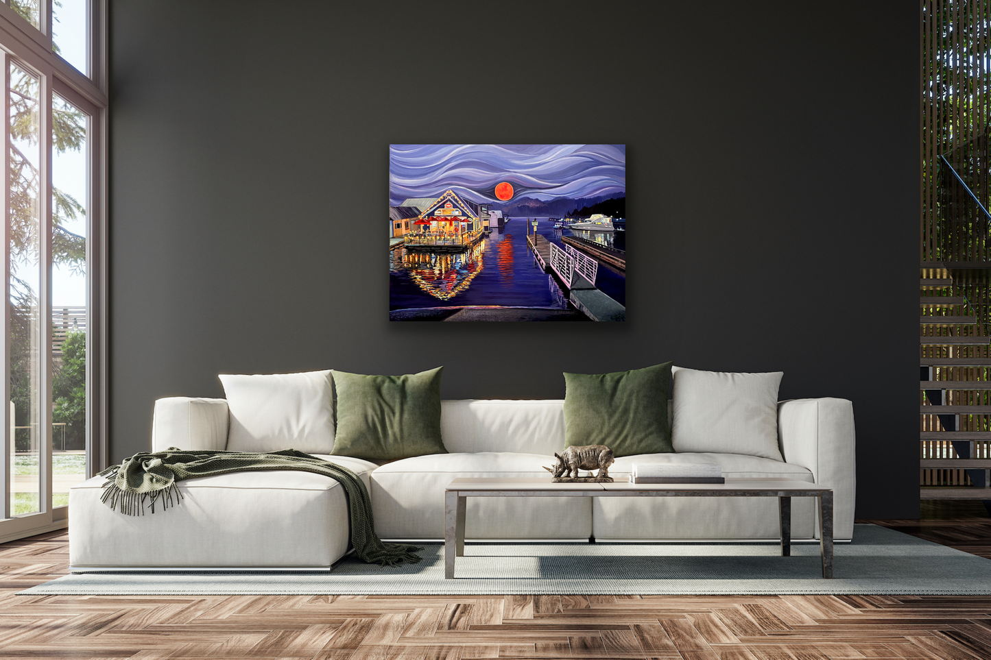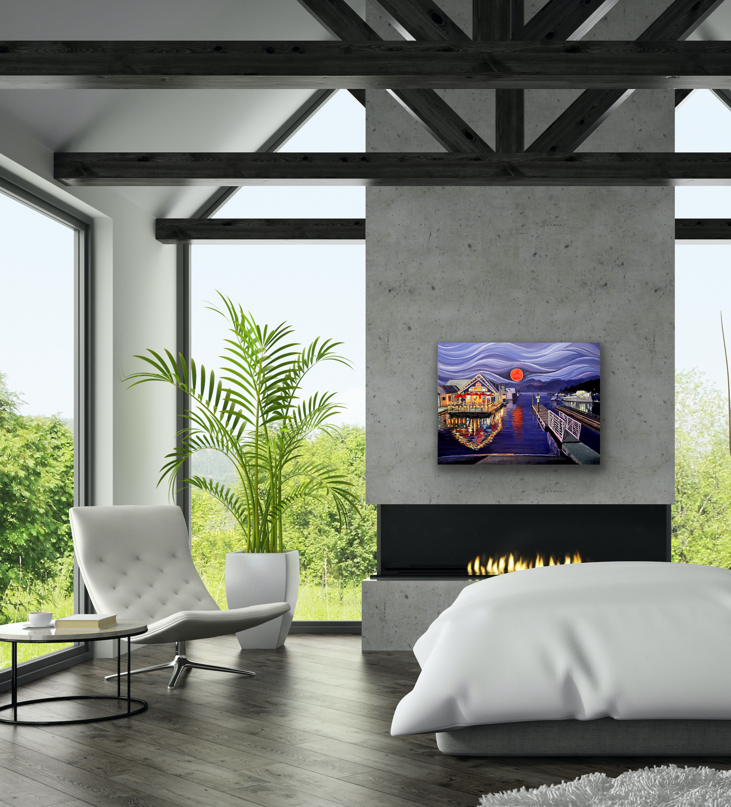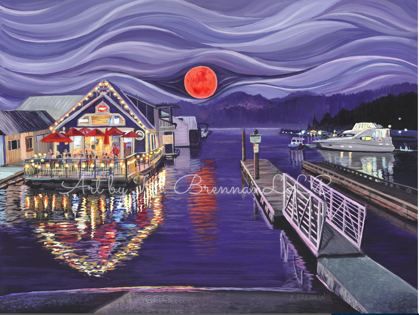 The Moon Was on Fire original painting is inspired by one of my favorite places, Bayview Idaho. This painting is a tribute to the Lake House which is an iconic floating restaurant that operates during the summer months. However, it is no longer in operation. The reference photo was taken during the summer fires which turned the moon red. Bayview is a small town on lake Pend Orielle, known for it's unique military history, floating homes and fishing.